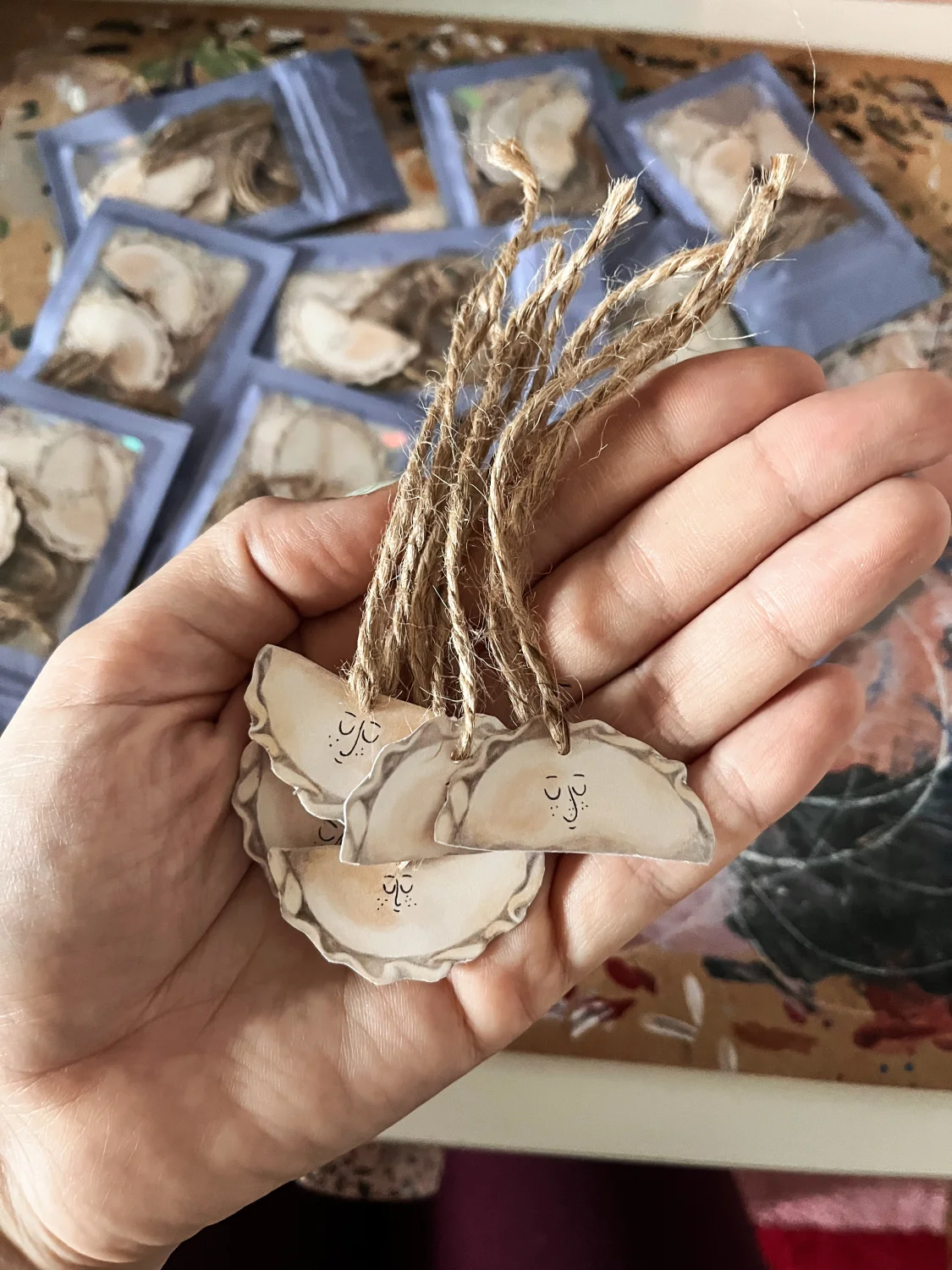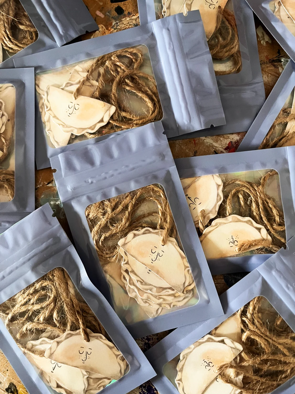 Zestaw pięciu, słodkich pierożków! Te ręcznie wycinane maluszki będą uroczymi bilecikami do prezentów :).