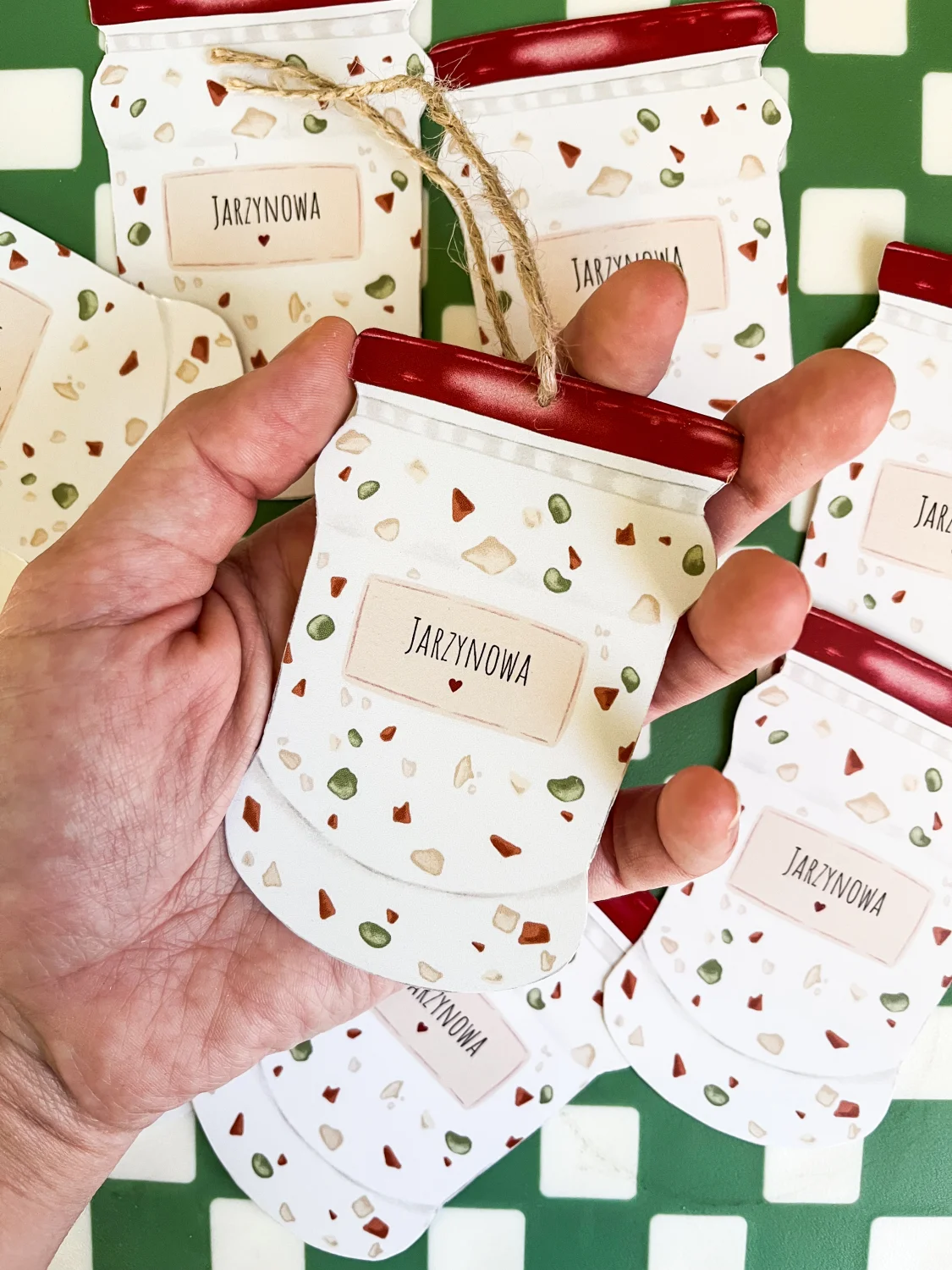 Słoiczek z sałatką jarzynową jako bilecik do prezentu! Ręcznie wycinany będzie uroczym dodatkiem :)