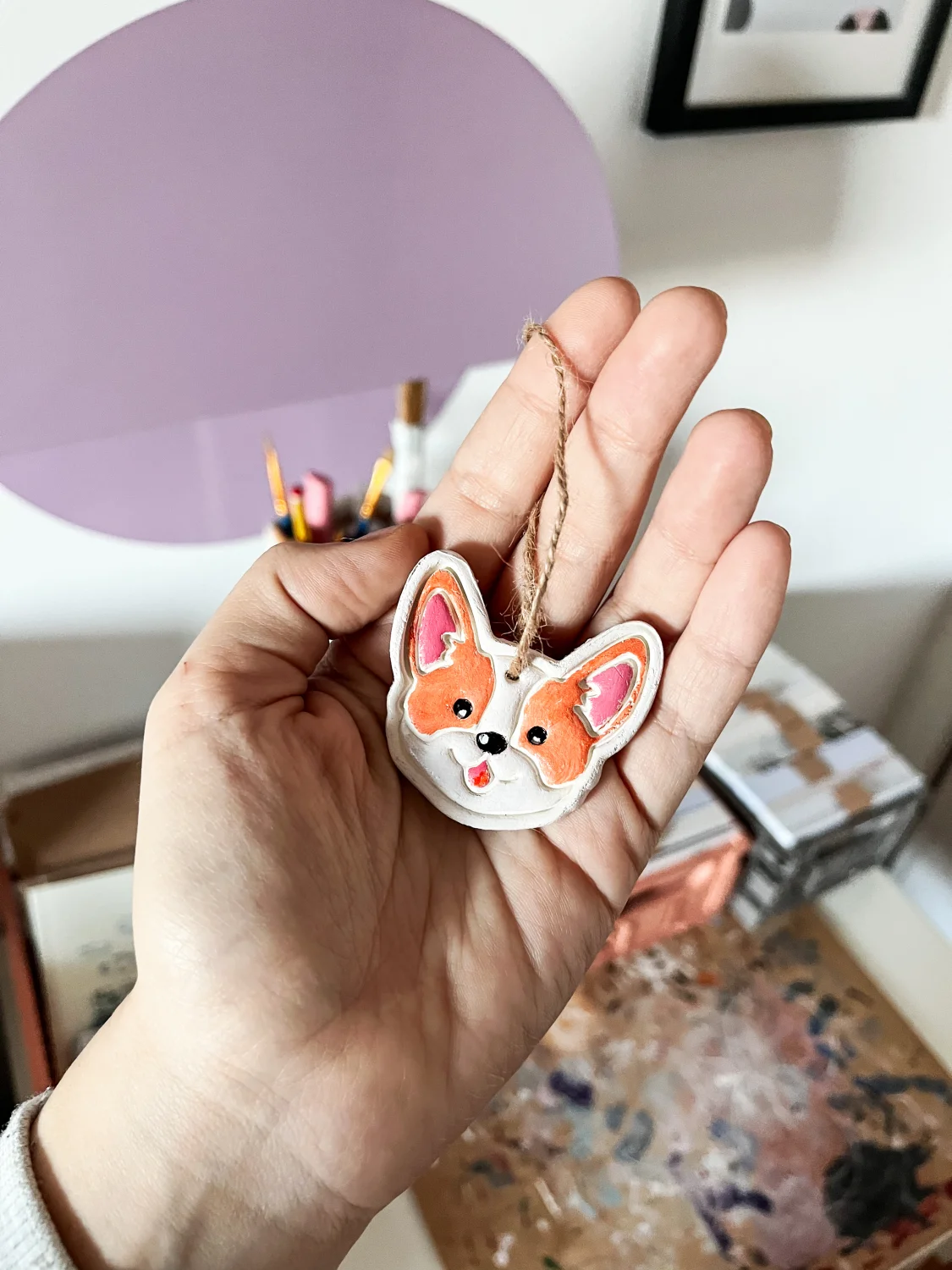 Zawieszka ulepiona z masy modelarskiej. Ręcznie malowana dlatego już nigdy nie powstanie identyczny egzemplarz :)